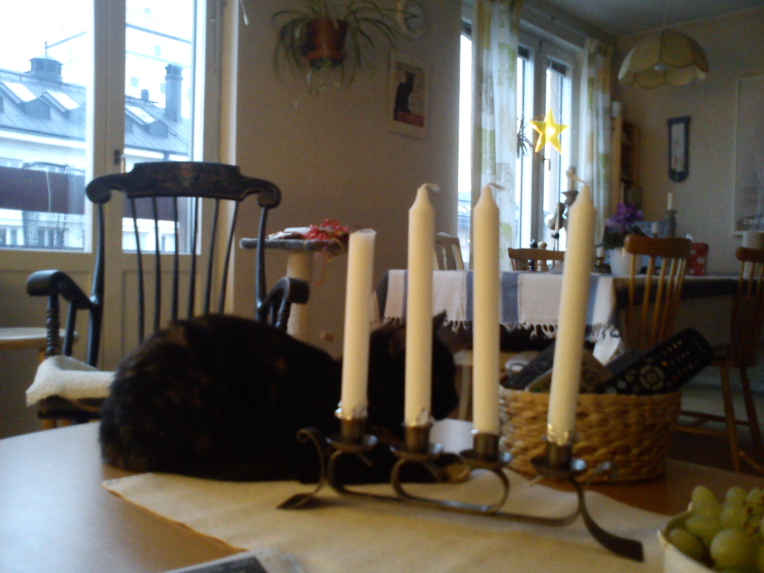 Och de övriga paketen ligger oöppnade på katternas ”presentbord” (klösöpelaren) än idag….andra ljuset i advent är o-tänt…..Kom igen nu mattarna!