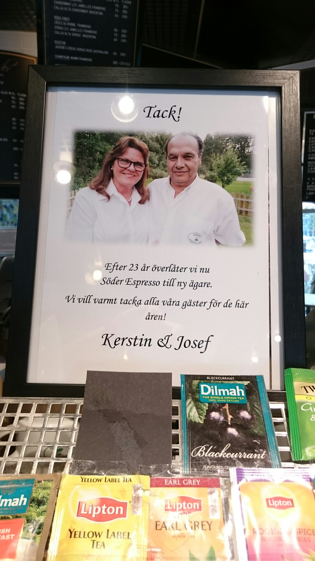 Alltid samma vänliga och glada bemötande – Är det redan fredag? En cappuccino som vanligt? All personal har varit lika hjärtlig och tillmötesgående, men det har till stor del berott på caféägarna. De har varit själva hjärtat och förebilderna för sin personal, och sina kunder….I över tjugo år har de haft stället och jag har varit där ungefär lika länge. Det har varit basen och grunden för mitt välbefinnande under perioder när det har stormat lite extra omkring mig på jobbet.