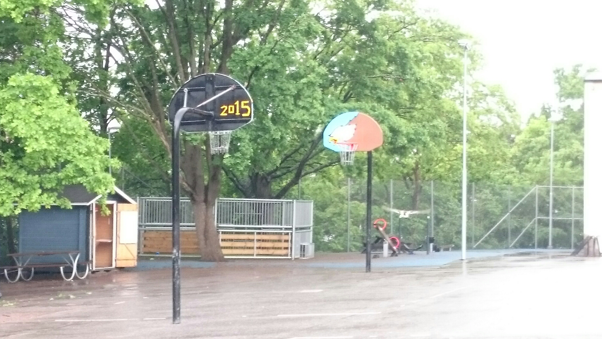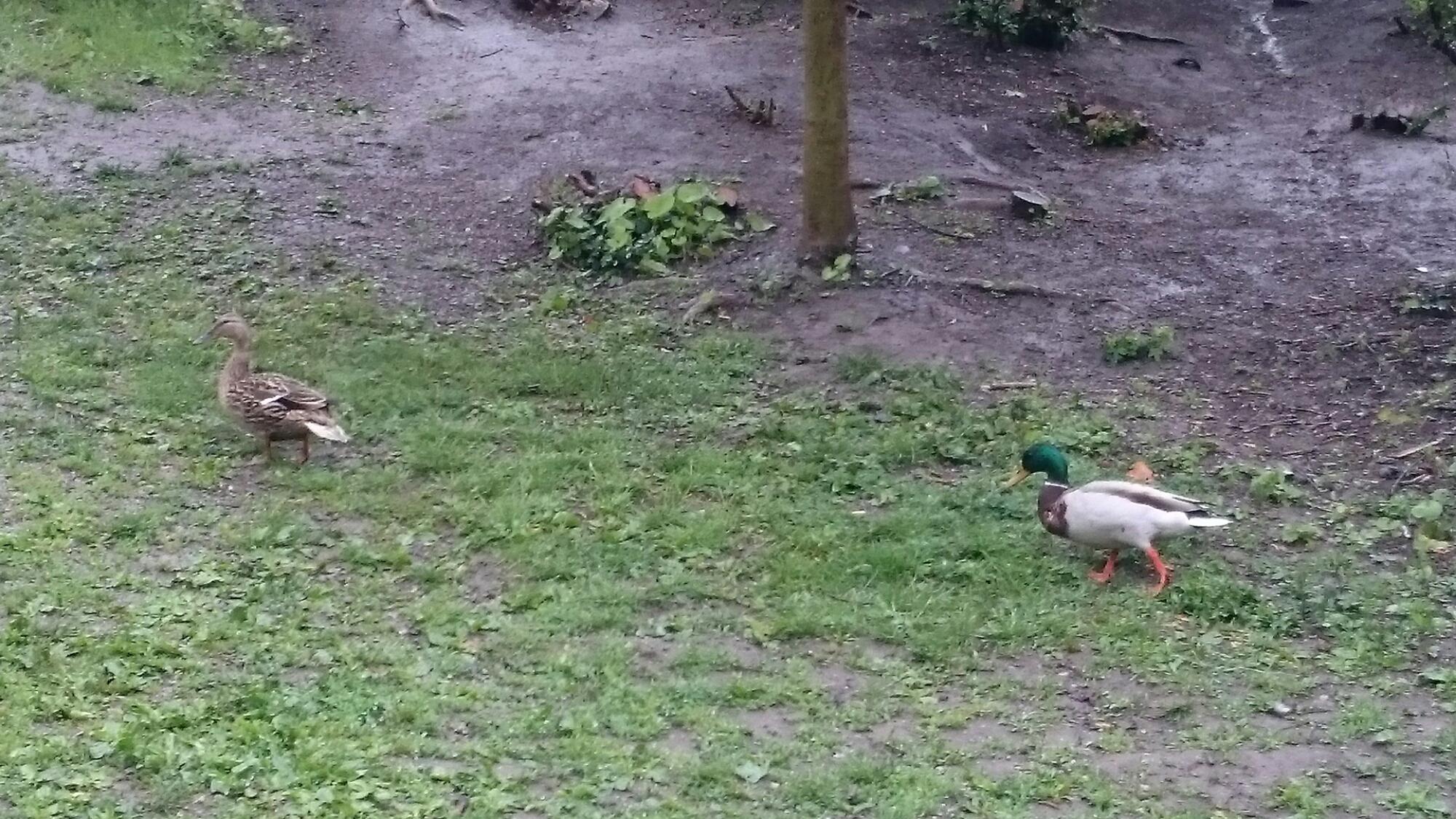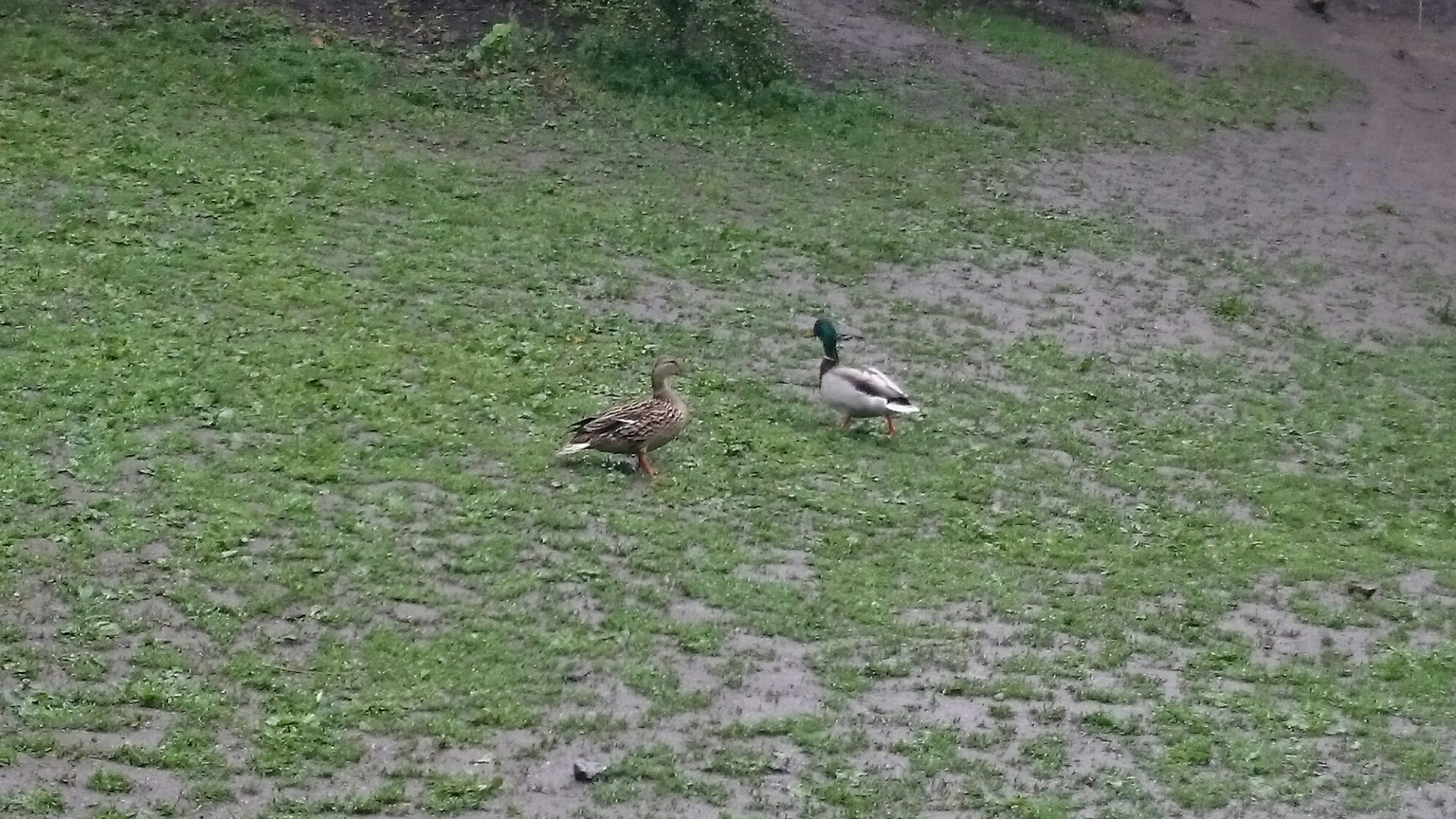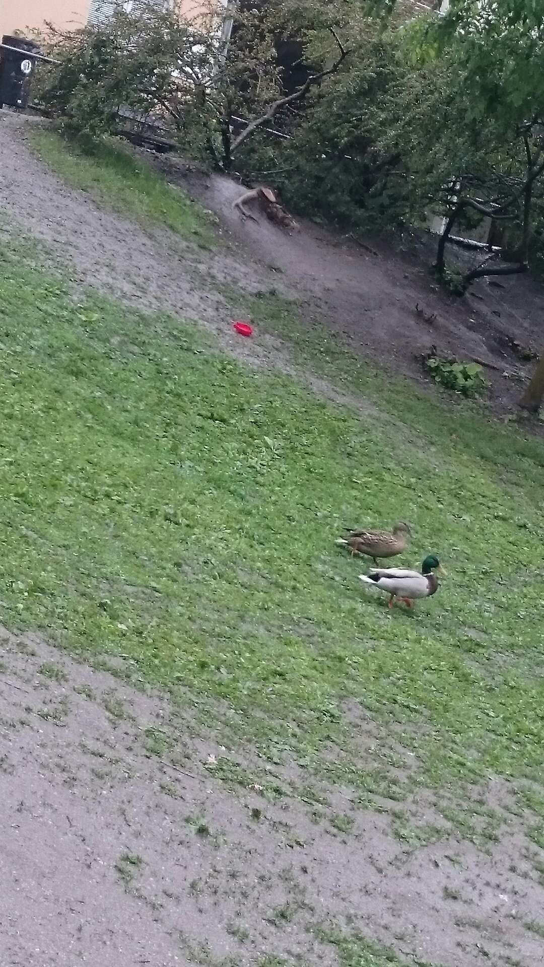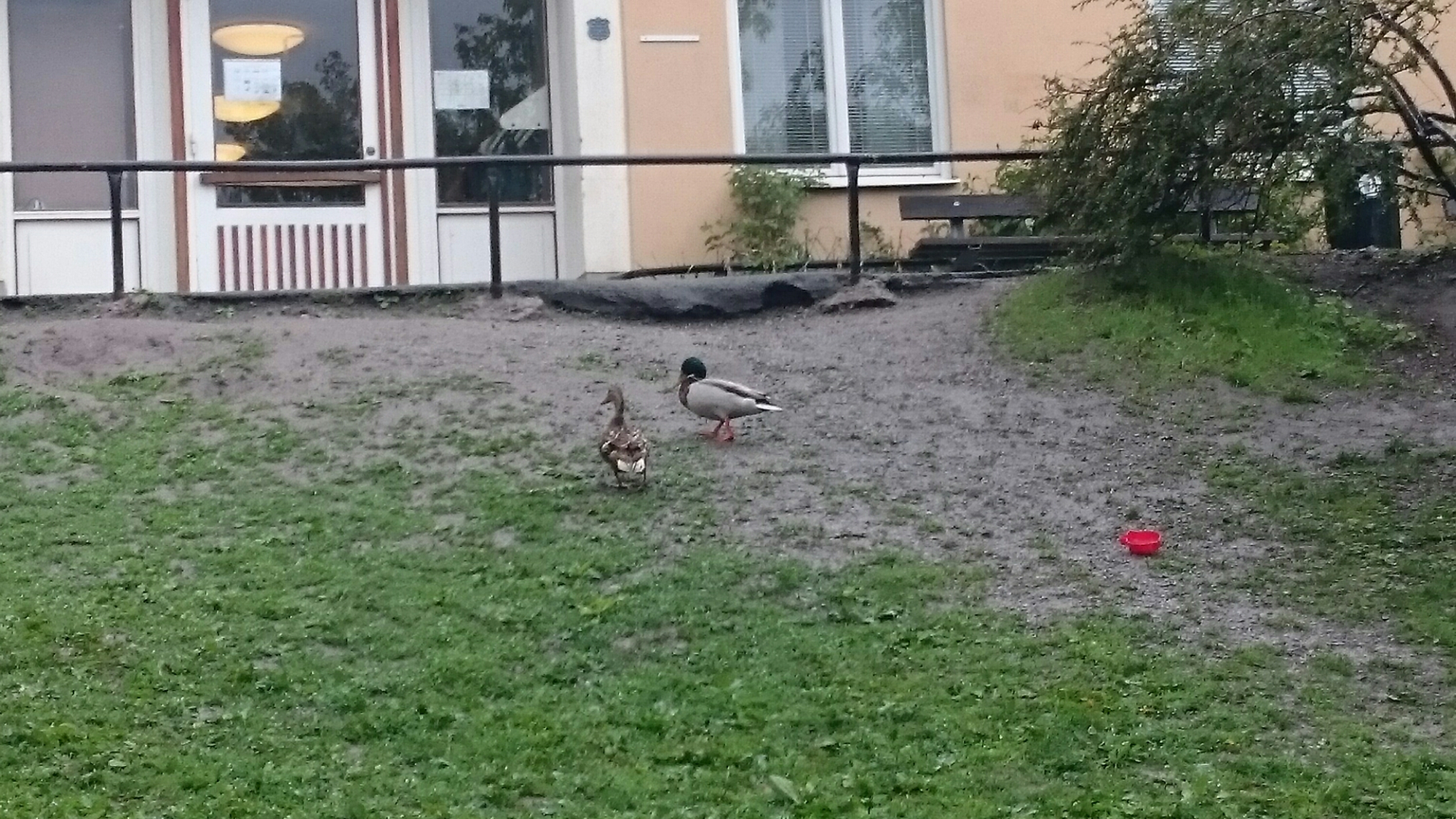 Ett gräsandspar promenerade på skolgårdens grässlänt.