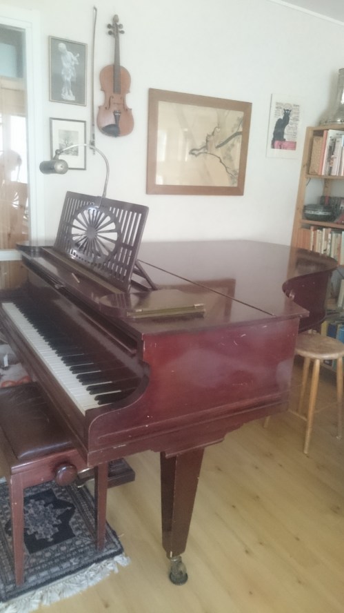 Sommarsång är nästan det enda stycke jag fortfarande kommer ihåg sedan jag gick i pianoskola, som barn, och knappt ens den kan jag alltså…När jag idag försökte göra en inspelning igen, för att äntligen avsluta det jag en gång påbörjat, blev det säkert 10 misslyckade inspelningar, innan jag kom vidare förbi dit jag kom förra gången. Problemet är ju nämligen att fingrarna tycks minnas felspelet lika väl som de rätta tonerna. Har jag en gång spelat fel på ett ställe, spelar jag samma fel nästa gång, och tvärtom.Ganska märkvärdigt att jag kan spela låten överhuvudtaget efter så många år utan övning. Visst blir det några klavertramp, men jag är förvånad över att jag kommer ihåg nåt alls. Ibland är det som om det går allra bäst när jag inte tänker överhuvudtaget och inte har en aning om vad jag gör, men ibland går det inte alls om jag inte fokuserar till max på vilka toner och ackord jag ska ta. Det skulle vara intressant att veta vad som händer i hjärnan, egentligen.Man kan inte lära gamla hundar sitta, sägs det, men jag skulle bra gärna vilja lära mig att läsa noter lite snabbare och bättre. Så kunde jag lära mig nya låtar lite fortare, och inte bara spela gamla, bara nästan lika bra som när jag var ung…. 😉När jag sjunger i kör, däremot, är det notläsningen jag har lättast för, och även när jag spelar altfiol, men det är ju bara en stämma i taget. Detta att hantera ett för mig nytt instrument är ju svårt, så där kan jag ju vara glad att åtminstone inte notläsningen är det värsta hindret. Där kan man snacka om att själva spelandet är det som går trögast. Men å andra sidan är utvecklingspotentialen mycket större än med mitt pianospel. Jag kan bli besviken när jag inte spelar lika bra på repetitionen med orkestern som jag gjorde hemma tre timmar tidigare, men det är ingen stor grej. Jag är ju ändå så mycket bättre än för bara några veckor sen.