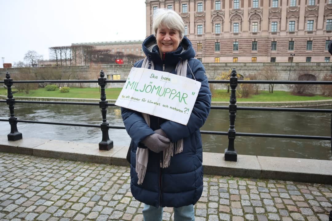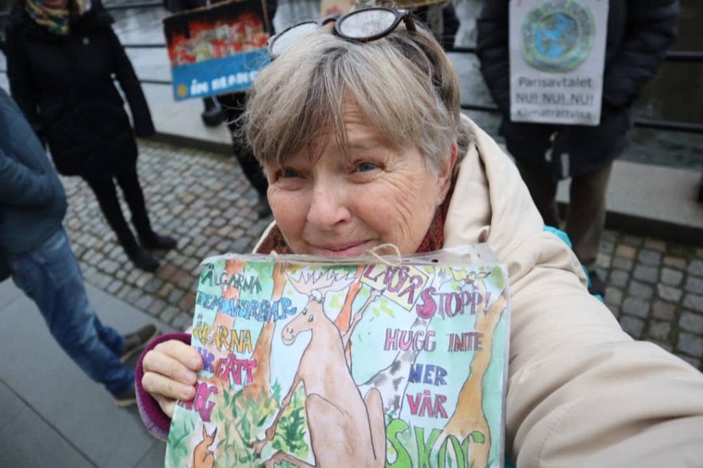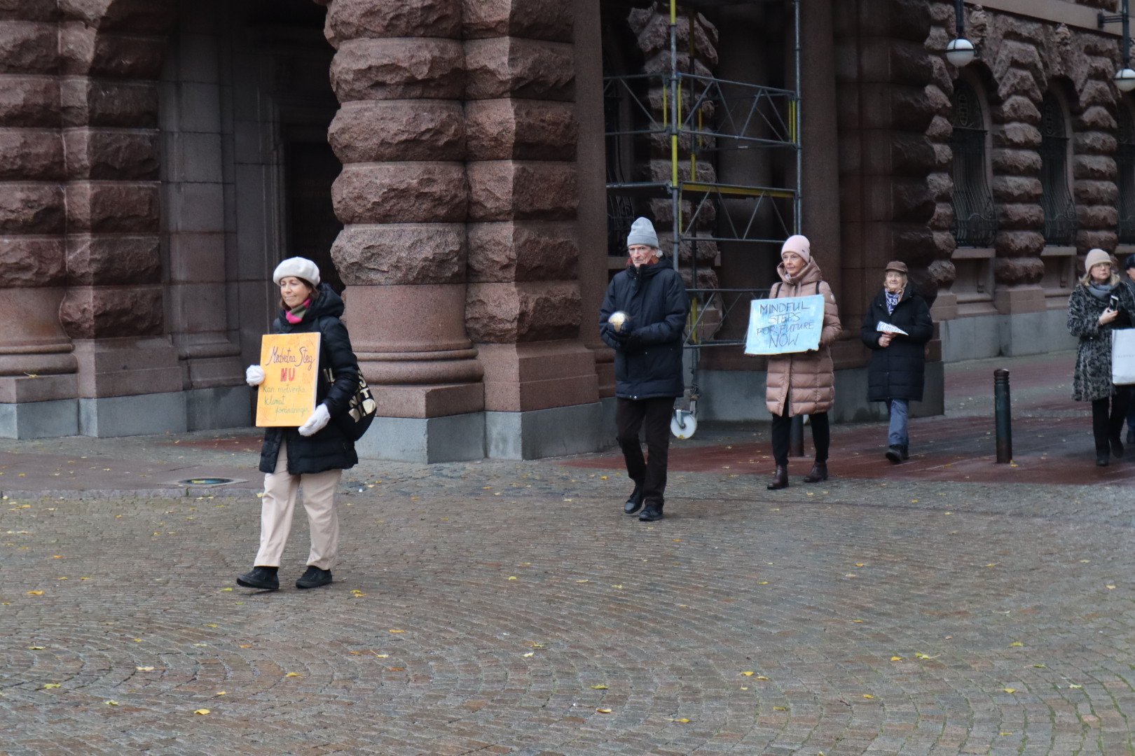 Ja, hur många är vi egentligen, som demonstrerar, agerar och skolstrejkar varje vecka? Väldigt många var det i Glasgow för några veckor sedan, och i hela världen, men just idag på Mynttorget och kring riksdagshuset och Sagerska var det väl mer spridda skurar, eller snarare ett väldigt milt, knappt förnimbart duggregn. Men fina skyltar och körsångare, ”mindful steps for future”, skolstrejkare och ”couching for future” stod där utposterade och väckte uppmärksamhet på olika sätt. Och en stor skolklass som gick förbi på slutet, som ropade ”Rädda klimatet” i kör. ”Många vattendroppar små, bildar en stor å”.