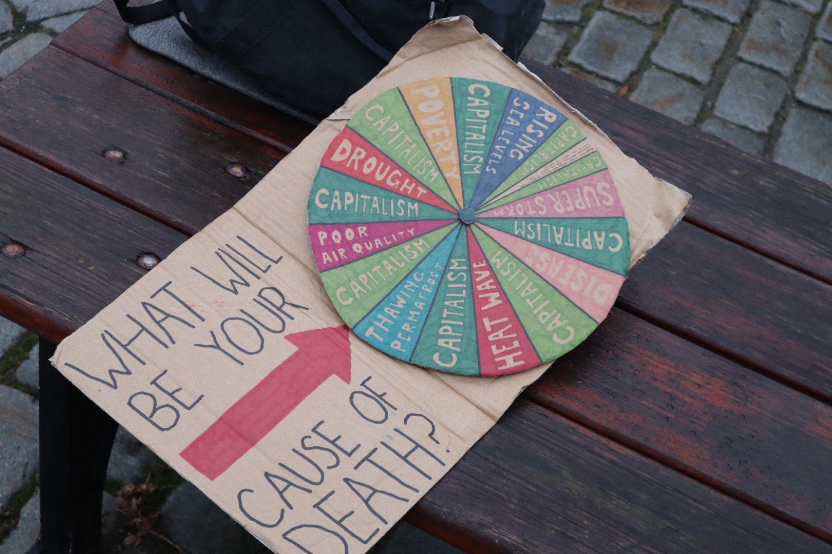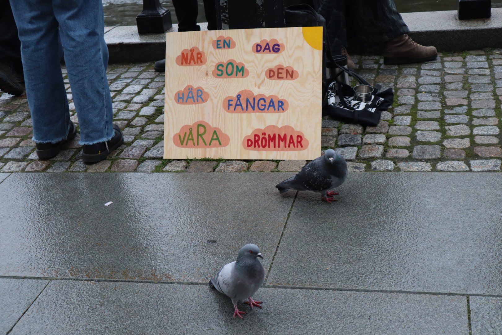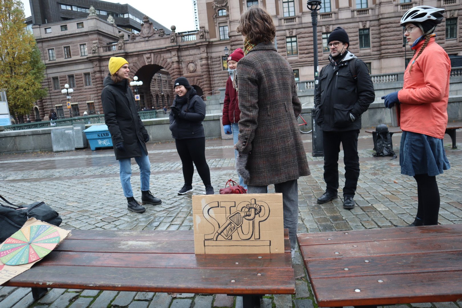 Ja, hur många är vi egentligen, som demonstrerar, agerar och skolstrejkar varje vecka? Väldigt många var det i Glasgow för några veckor sedan, och i hela världen, men just idag på Mynttorget och kring riksdagshuset och Sagerska var det väl mer spridda skurar, eller snarare ett väldigt milt, knappt förnimbart duggregn. Men fina skyltar och körsångare, ”mindful steps for future”, skolstrejkare och ”couching for future” stod där utposterade och väckte uppmärksamhet på olika sätt. Och en stor skolklass som gick förbi på slutet, som ropade ”Rädda klimatet” i kör. ”Många vattendroppar små, bildar en stor å”.