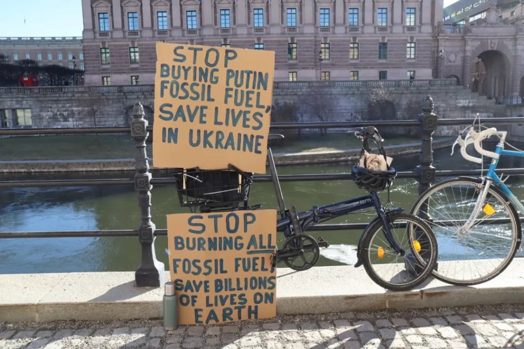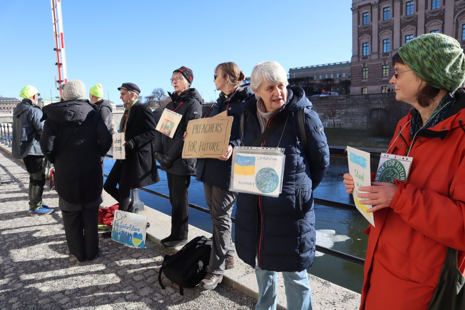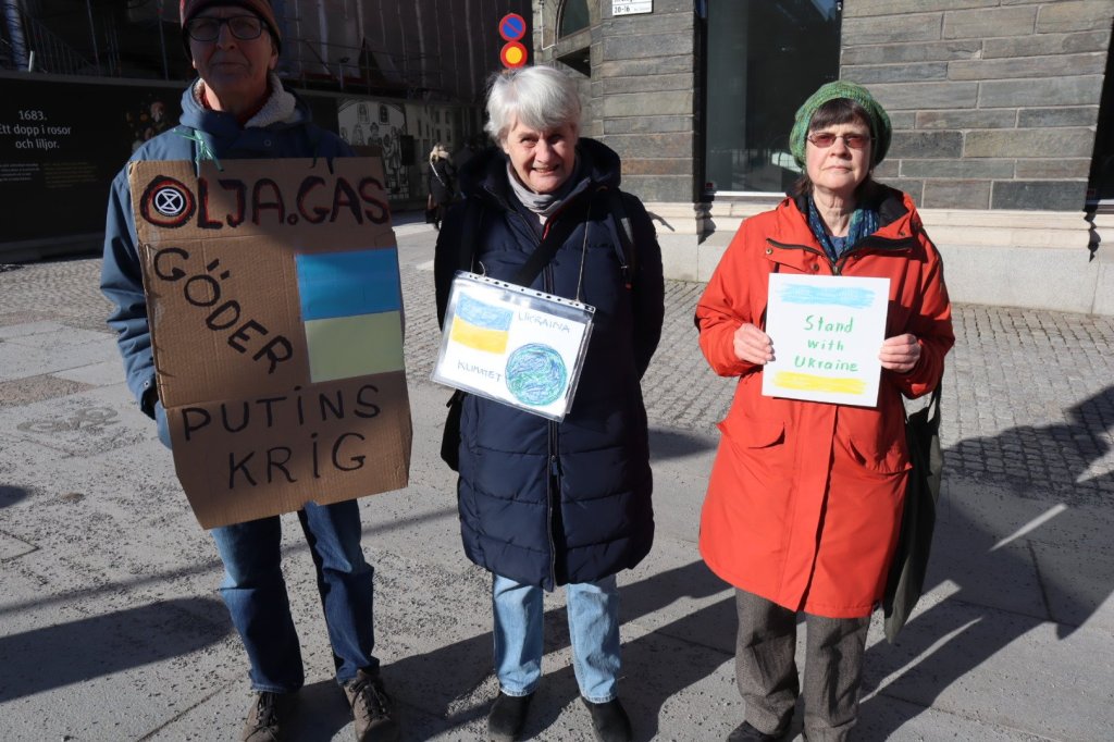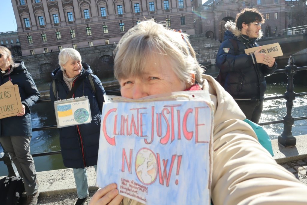 I skuggan av ett krig står vi utanför Sagerska, och kampen för ett bättre klimat inkluderar också kampen för fred, demokrati och mänskliga rättigheter. I den kampen – mot en envåldhärskares krig i Europa – är vi många som kan enas. Hela riksdagen kan också enas (till slut) när ett krigshot är så nära inpå. Det är trösterikt ändå att veta. Precis som i början av pandemin, kan alltså riksdagens partier sluta ”borgfred”. Och precis så önskar jag av hela mitt hjärta att alla kan sluta upp omkring kampen mot den globala uppvärmningen.