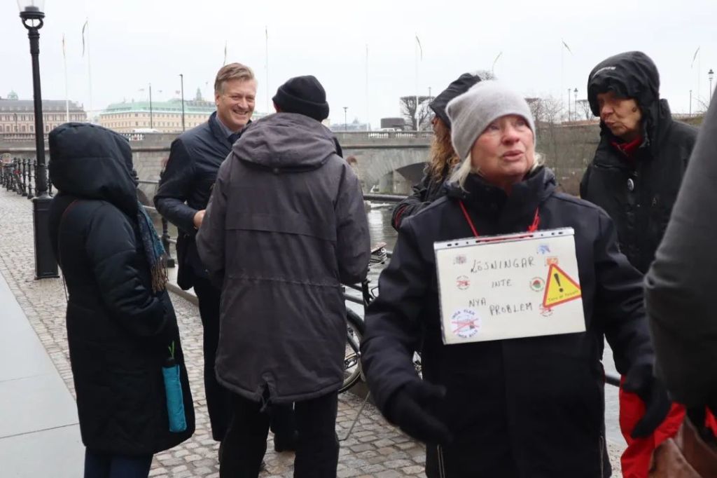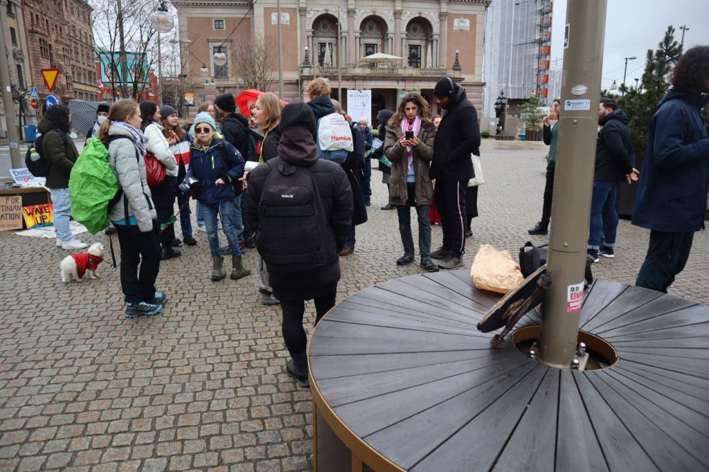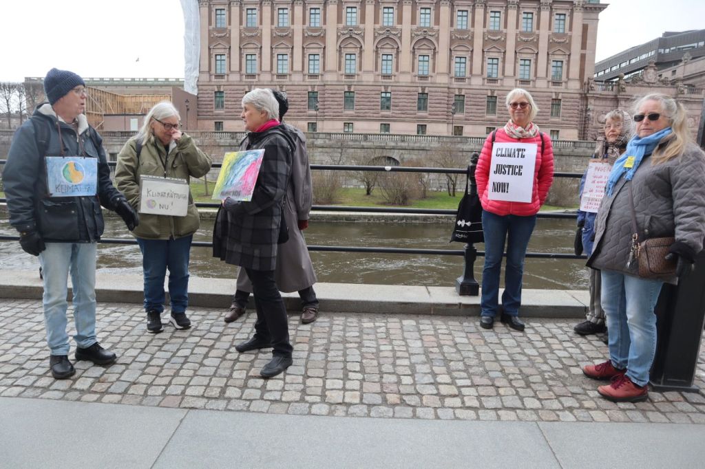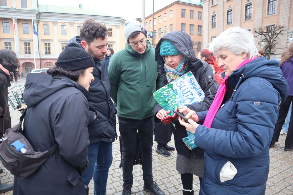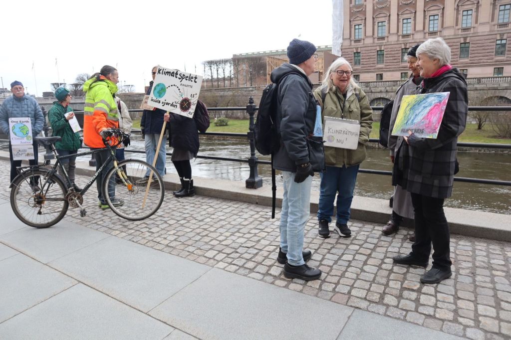 På Mynttorget pratade vi med några trevliga killar från Lidingö, som frågade om vi brukade limma fast oss på motorvägar. Det sa vi att vi inte gör, men att klimatrörelsen är bred och metoderna är många, och även om inte vi har valt att ”limma fast oss”, har just de aktionerna fått ett väldigt genomslag medialt, på det sättet att nästan alla människor numera känner till begreppet ”att återskapa våtmarker”. De kunde se vitsen med det, och trots att metoden på kort sikt kan kännas kontraproduktiv, kan den på lång sikt ”bära frukt”.