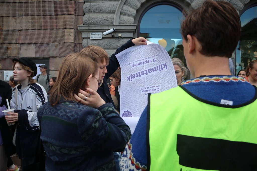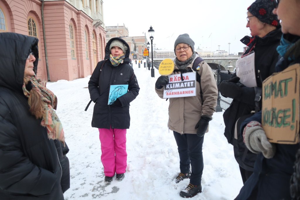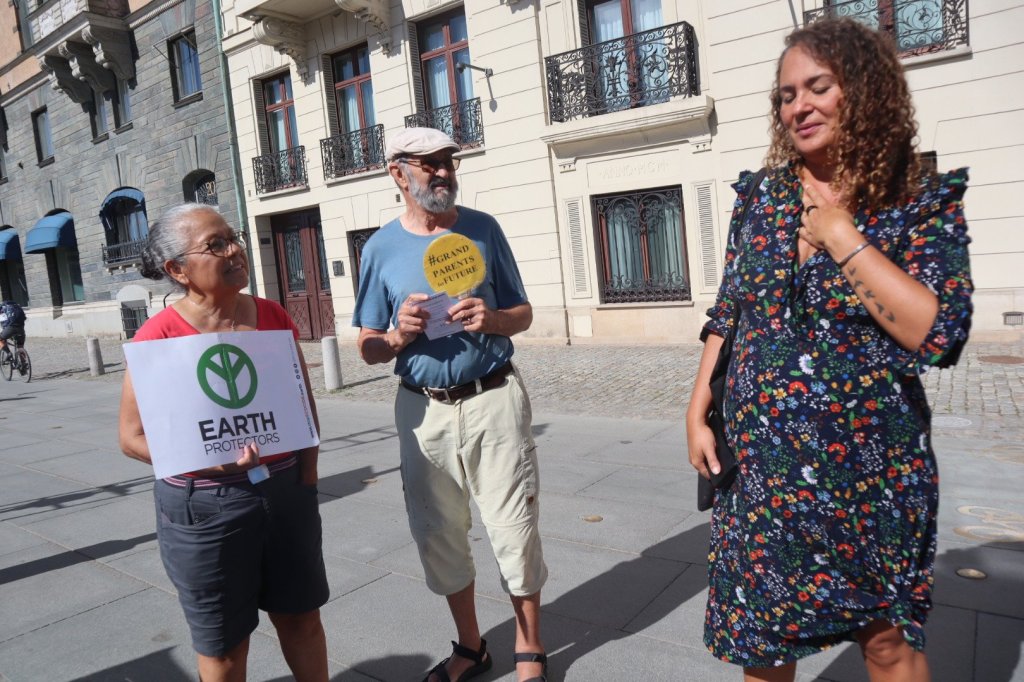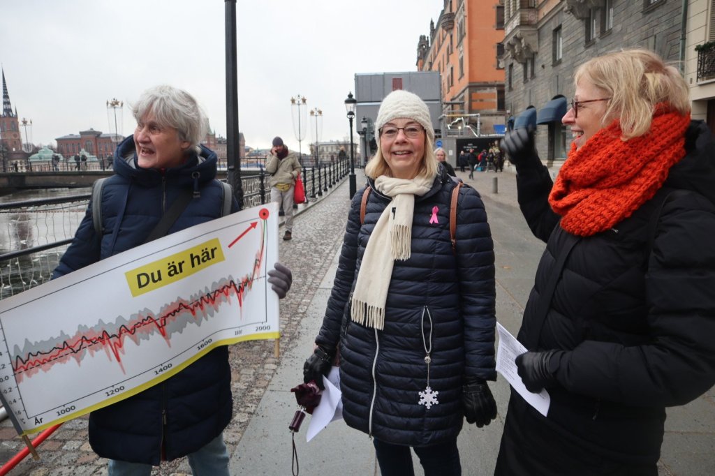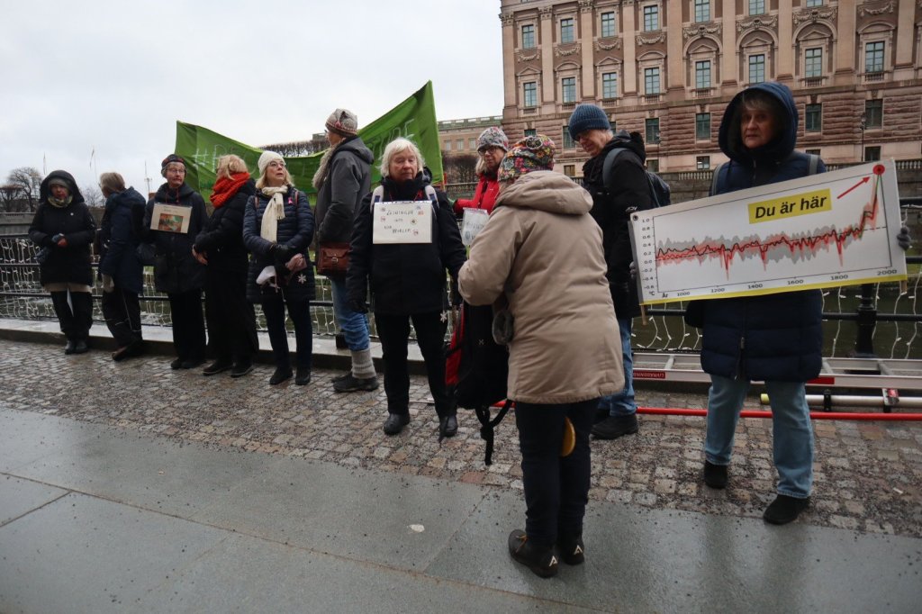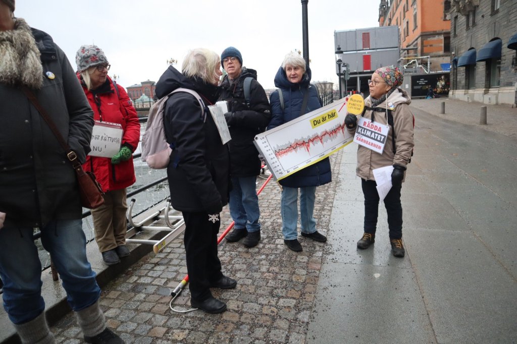 På Mynttorget pratade vi med några trevliga killar från Lidingö, som frågade om vi brukade limma fast oss på motorvägar. Det sa vi att vi inte gör, men att klimatrörelsen är bred och metoderna är många, och även om inte vi har valt att ”limma fast oss”, har just de aktionerna fått ett väldigt genomslag medialt, på det sättet att nästan alla människor numera känner till begreppet ”att återskapa våtmarker”. De kunde se vitsen med det, och trots att metoden på kort sikt kan kännas kontraproduktiv, kan den på lång sikt ”bära frukt”.