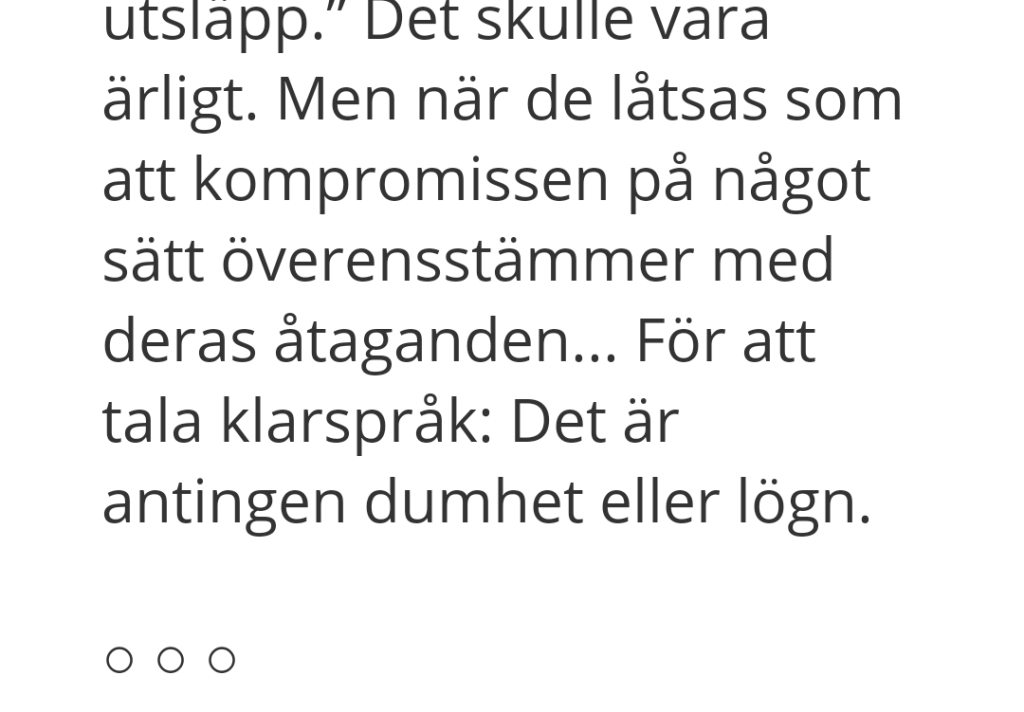 Det här är bara en fråga av många, där våra politiker tar felaktigt kortsiktiga beslut. För att i nästa stund prata vitt och brett om hur mycket de bryr sig om miljö och klimat…. Det är ju bra att de åtminstone pratar om det, vilket de inte gjorde inför förra valet när Greta Thunberg för första gången satte sig utanför riksdagshuse för att skolstrejka, men vad hjälper det? Utsläppen av fossila bränslen minskar inte av en massa prat – en massa ”bla, bla, bla” – för att tala med Greta.