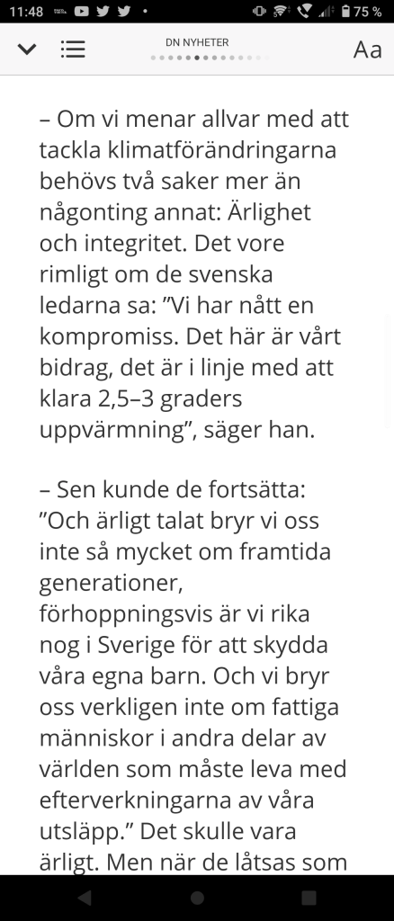 Ärlighet varar längst, sägs det. Sverige lever inte upp till Paris-avtalet med våra klimatmål, enligt forskarna. I DNs granskning av klimatmålen kommer vi inte klara 1,5 grads uppvärmning. Snarare kommer vi hamna på 2,5 till 3 graders uppvärmning och eftersom vi inte har tagit hänsyn till klimaträttvisa i våra beräkningar så kommer vi inte uppnå ”noll-utsläppsmålet” 2045. Klimatforskaren Kevin Andersson är kritisk till hur man inte har följt Paris-avtalet ur rättvisesynpunkt. Där sägs det att rikare länder måste göra mycket mer än de fattiga länderna. Den allra rikaste procenten – en procent – av jordens befolkning är orsak till mer fossila utsläpp än hälften av jordens fattiga länder. Det är ju inte rättvist! Kevin Andersson säger att våra politiker måste tala klarspråk. (Se text i bilderna!)