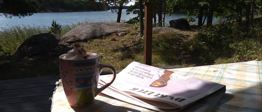 Men framförallt njuter jag av att sitta på landet med benen i kors och se ut över den blåa fjärden och inte behöva åka hem från semestern eller packa och städa ur sommarhuset. Jag kan bara sitta här och (snörvlande) lukta på blommorna och hostande andas in den friska lantluften och hoppas på bättre tider och att jag blir igenkänd den dagen jag återvänder till stadens larm och brus.